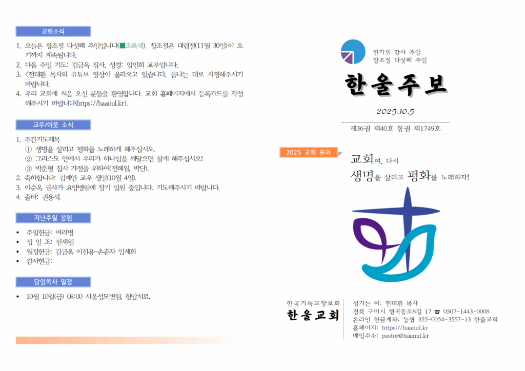 2025.10.5(일) 구미 한울교회 주일예배 생방송, 주보