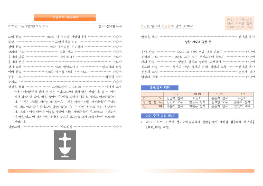 2025.10.19(일) 구미 한울교회 주일예배 생방송, 주보