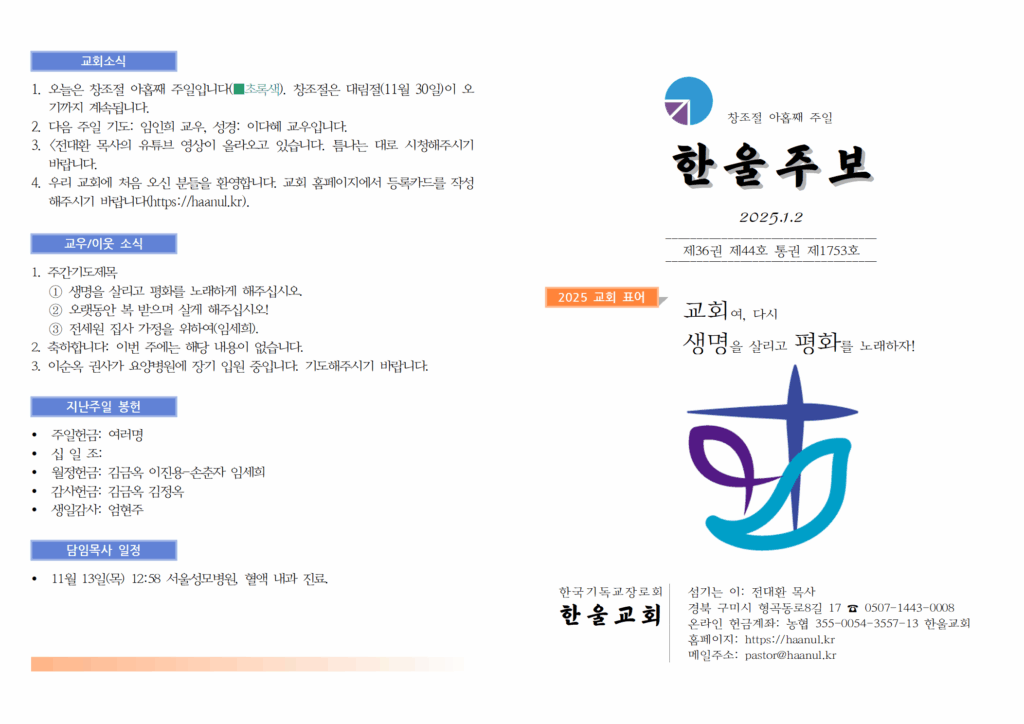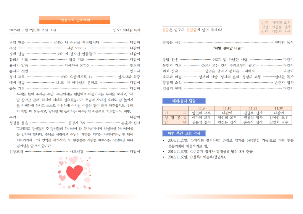 2025.11.2(일) 구미 한울교회 주일예배 생방송, 주보